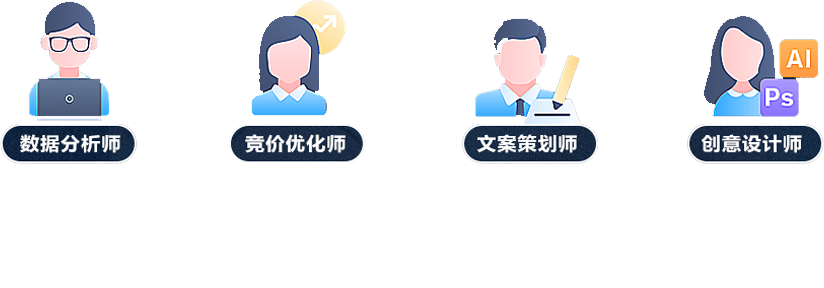 競價優(yōu)化師和文案策劃師,實時 分析投放人群興趣點的變化,結(jié) 合業(yè)務優(yōu)勢,策劃全新的廣告創(chuàng) 意、圖片及競價頁面